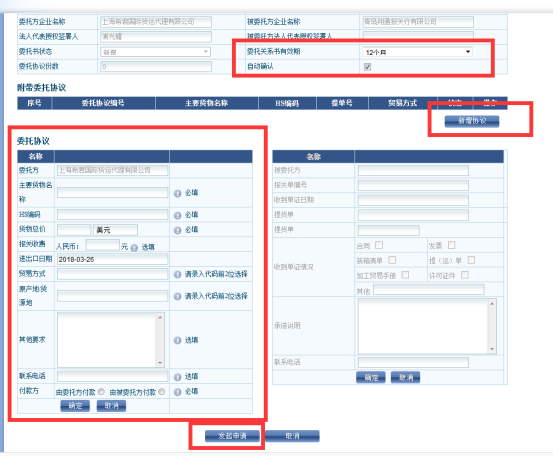 1、登錄中國電子口岸網(wǎng) http://www.chinaport.gov.cn 2、登錄 3、輸入密碼 4、選定代理報關(guān)委托 5、發(fā)起申請——搜索 上海奕亨報關(guān)有限公司3122480089——查詢——發(fā)起委托 6、發(fā)起委托 7、有效期12個月,自動確認(rèn)——新增協(xié)議——填資料——確認(rèn)——發(fā)起申請